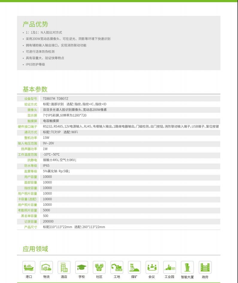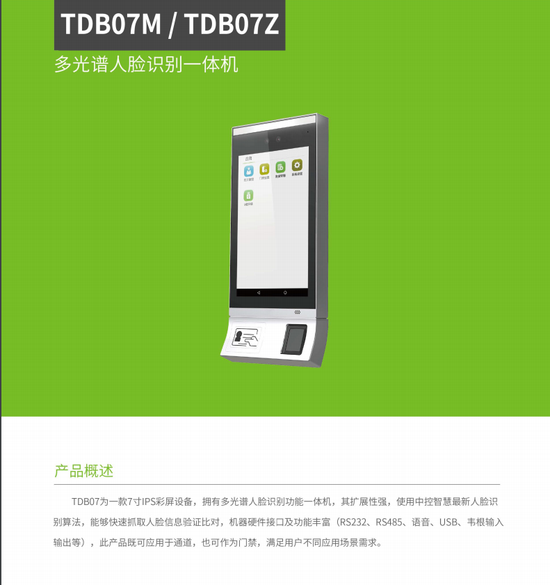 • 產品描述:TDB07M/TDM07Z為一款7寸IPS彩屏設備,擁有多光譜人臉識別功能一體機,其擴展性強,使用中控智慧最新人臉識別算法,能夠快速抓取人臉信息驗證比對,機器硬件接口及功能豐富(RS232、RS485、語音、USB、韋根輸入輸出、輔助輸入輸出等),此產品既可應用于通道,也可作為門禁,滿足用戶不同應用場景需求。